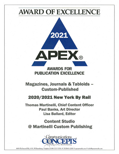 In July 2021, Lisa was honored with an APEX Award for the third year in row as editor of New York By Rail, in the category Magazines, Journals and Tabloids - Custom-Published. APEX awards recognize excellence in writing, publications, campaigns, programs, design and media by publishers, editors, writers and designers. New York by Rail is published annually and distributed to Amtrak passengers in New York, Vermont, Quebec and Ontario. Click here to view the award larger.